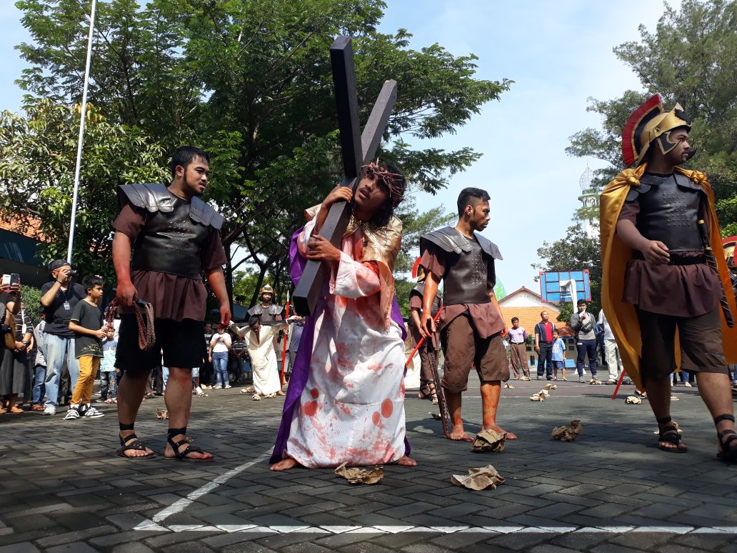 Sementara, dalam pentas drama kolosal yang diperankan muda-mudi Gereja Katolik Santo Mikael Surabaya itu bertujuan menapak tilas Yesus. Kisah yang dimainkan anak muda gereja tersebut memvisualkan Yesus ketika menghadapi beberapa kali pengadilan di bawah pemuka agama Yahudi dan Kerajaan Romawi di abad ke- 1 Masehi.