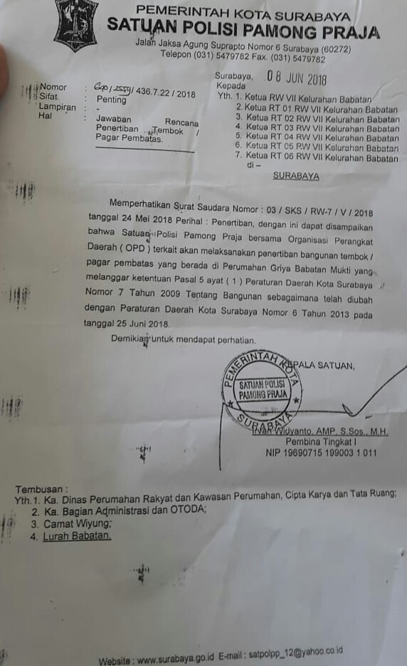 Dalam pembongkaran akses jalan fasum bagi warga perumahan tersebut telah di hadiri petugas Kepolisian, koramil dan Dinas Cipta Karya Pemerintah Kota Surabaya yang di laksanakan atas Perintah Satpol PP Pemkot Surabaya.