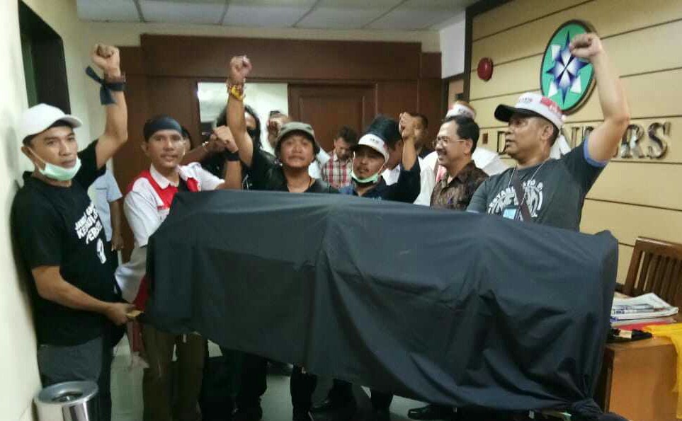 SURABAYA, {DETEKTIFNews.com}-Atas keprihatinan wartawan turun kejalan dan memasuki Kantor dewan Pers, perwakilan dari berbagai media di dua lokasi berbeda di Jakarta diwarnai aksi tutup mulut dengan lakban dan pengusungan keranda mayat protes matinya kebebasan pers.