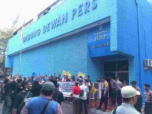 Lokasi pertama yang digeruduk ratusan wartawan dari berbagai penjuru tanah air ini adalah gedung Dewan Pers, sambil mengusung keranda mayat dari kelompok wartawan Sinar Pagi Baru, media tempat almarhum Muhammad Yusuf bekerja.