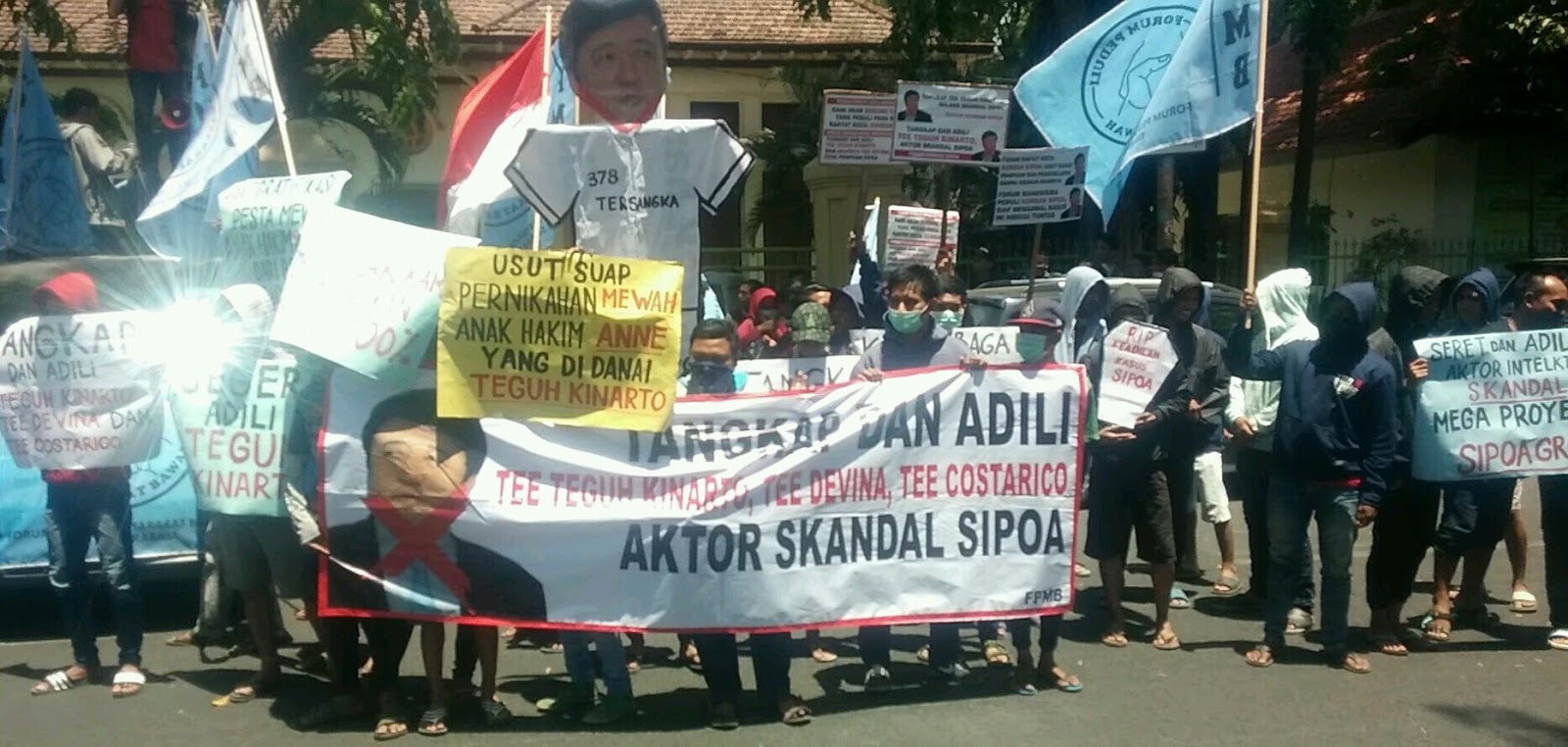 Dalam demo itu ada sejumlah spanduk yang terpampang, yakni Tangkap dan Adili Teguh Kinarto, Tee Devina, Tee Costarico.