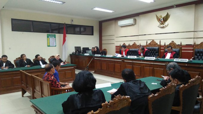 “Kedua terdakwa dinyatakan terbukti bersalah melanggar pasal 3 junto pasal 18 Undang-undang RI Nomor 31 Tahun 1999 tentang pemberantasan Tindak Pidana Korupsi sebagaimana telah diubah dan ditambah dengan Undang-undang RI Nomor 20 Tahun 2001 tentang perubahan atas Undang-undang RI Nomor 31 Tahun 1999 tentang pemberantasan Tindak Pidana Korupsi juncto pasal 55 ayat (1) ke-1 KUHP,” ucap Hakim Dede Suryaman.