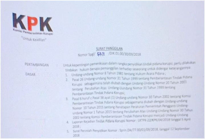Kepada sejumlah awak media, Rijanto, mengaku memang mendapatkan surat berlogo KPK. Dalam surat itu, Rijanto diminta untuk hadir guna menjalani pemeriksaan di kantor KPK pada, Senin 15 Oktober 2018.