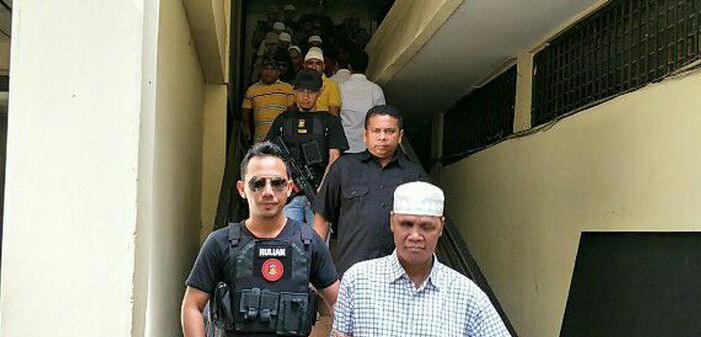 Hercules keluar dengan setelan kemeja putih, kopiah putih, dan celana jeans biru serta sepatu. Di belakang, terdapat 12 anggota kelompoknya yang berjalan berpasangan dengan borgol di tangan dan diamankan sejumlah polisi bersenjata.