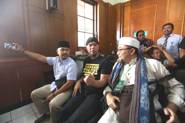 SURABAYA {DETEKTIFNEWS.com} – Sidang perdana terdakwa artis penyanyi Ahmad Dhani dalam kasus ujaran kebencian dengan kata ‘idiot’. Dalam sidang tersebut, ADP mengenakan kaos hitam bertuliskan ‘Tahanan Politik’ berwarna kuning serta blankon khasnya, digelar di ruang Cakra PN Surabaya, Kamis (7/2-2019).