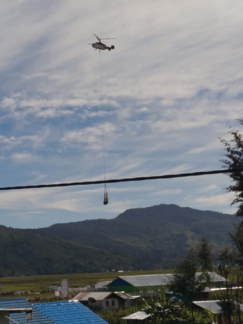 PAPUA, {DETEKTIFNEWS.Com}-Distrik Sugapa Kabupaten Intan jaya merupakan daerah pegunungan yang belum bisa di jangkau angkutan Darat, dalam rangka Program Pemerintah percepatan pembanggunan di Daerah Papua untuk membangun Tower Kominfo menggunakan Helikopter, Jumat (22/2/19).