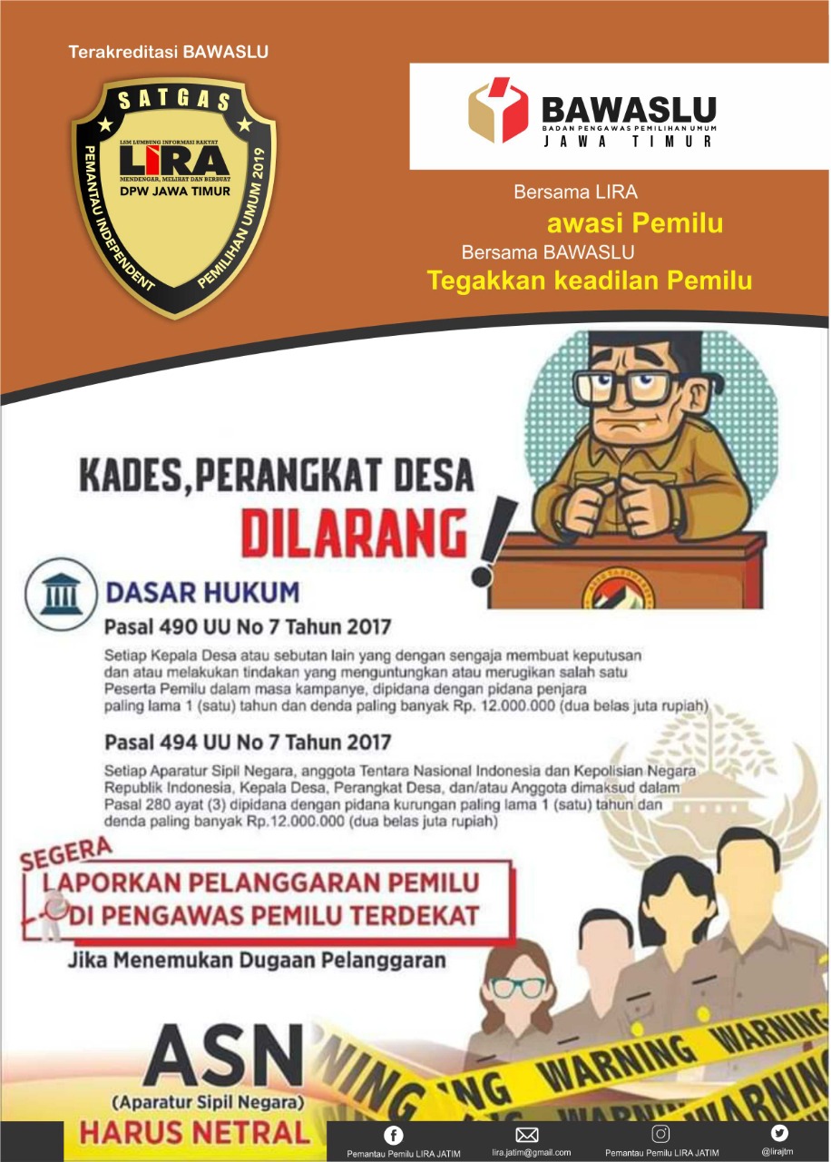 Demi menegakkan keadilan dan kemakmuran masyarakat Kabupaten Probolinggo, LSM – LIRA Kabupaten Probolinggo siap melaksanakan Tugas sebagai pemantau Pemilu yang akan di laksanakan pada 17 April 2019 mendatang.