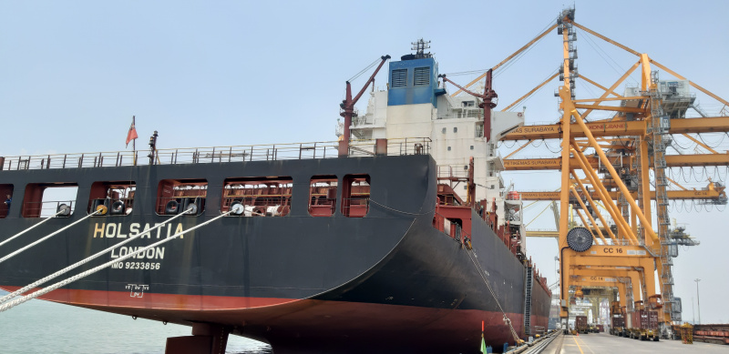 Kedatangan Kapal berbendera United Kingdom, MV Holsatia sandar di TPS pada Sabtu (6/4/2019) dini hari’ di kade 699 980 (berth 04), dengan membawa muatan 3.100 peti kemas atau sekitar 4.600 teus.