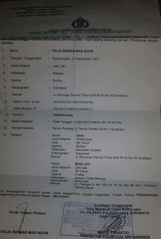 Lalu kejadian ini pun langsung dilaporkan ke Polrestabes Surabaya saat itu juga, oleh suami bernama Felix yang didampingi pengacara Pirman A Nadeak, SH, MH. Sesuai dengan laporan nomor: LP/B/377/RES.1.24/2019/Jatim/Restabes.Sby pada hari Sabtu tanggal 13-April-2019 sekira pukul 3.00 Wib dini hari.