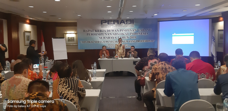 SURABAYA– Perhimpunan Advokat Indonesia (PERADI) Cabaang Surabaya di bawah pimpinan Robert Simangunsong, SH., M.H. telah mengadakan rapat kerja tahunan bersama anggotanya dengan Tema “Advokat Sebagai Penegak Hukum Yang Profesional”, acara berlangsung di Hotel JW Marriott Surabaya, Jumat (22/11/2019).
