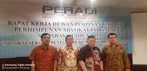 Acara gelar rapat kerja Perhimpunan Advokat Indonesia (PERADI) Dewan Pimpinan Cabang (DPC) Kota Surabaya ini, Dipimpin oleh pengurus harian yaitu; Robert Simangunsong,SH.,MH. sebagai Ketua DPC Surabaya, Pantas Sitindaon, SH selaku Sekretaris, serta, CH Wensen J Posumah,SH sebagai Bendahara.