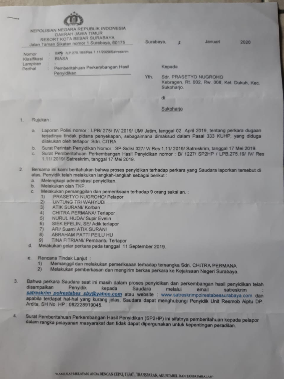 Dasar SP2HP tertanggal 2 Januari [dropcap][/dropcap]penyidik Resmob Polrestabes akan segera memanggil tersangka Chitra Permana untuk pemeriksaan lebih lanjut dan akan menyerahkan berkas perkaranya ke kejaksaan negeri Surabaya.