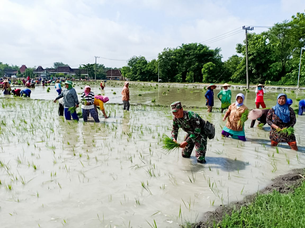 Tak ketinggalan dalam aksi yang diikuti 425 petani ini, Bintara Pembina Desa (Babinsa) Posramil 0813-18/Gayam Sertu Salim, juga turun langsung bersama masyarakat lainnya menancapkan bibit padi di Tanah Kas Desa (TKD) atau bengkok. Iringan Gamelan Jawa, mengiringi gerak dan langkah para petani yang sedang menanam padi.