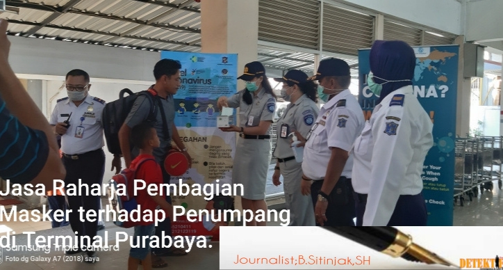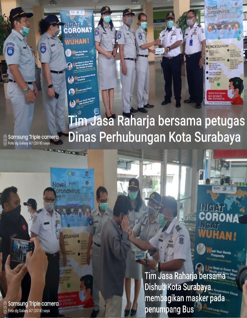 Dalam hal ini Jajaran BUMN PT. Jasa Raharja Cabang Jawa Timur ikut ambil bagian serta Bagi edukasi dalam pencegahan itu dengan kegiatan membagikan masker dan antiseftik hand sanitizer yang merupakan cairan pembunuh kuman pada penumpang Bus diruang kebarangkatan Terminal Purabaya.