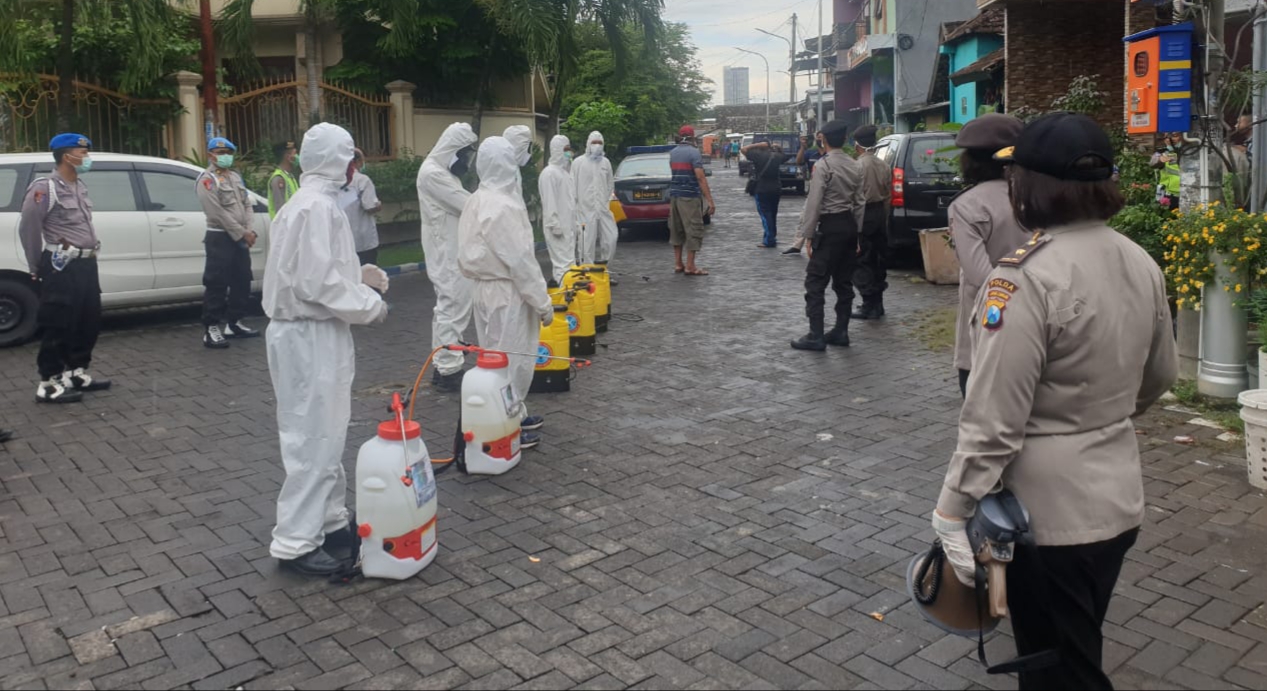 SURABAYA, {DETEKTIFNEWS.com}-Wadir Samapta Polda Jatim AKBP Hadi Winarno, S.I.K memimpin langsung melakukan pelaksanaan Penyemprotan cairan Disinfektan di beberapa gang diwilayah Jl. Ubi Komplek Bendul Merisi, Surabaya. 17 April 2020.