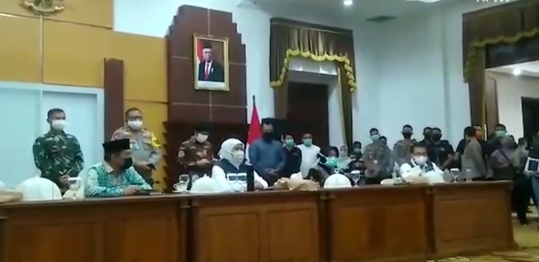 Khofifah Indar Parawansa Gubernur Jatim memberikan keterangan kepada pers setelah pertemuan itu didampingi Tri Rismaharini Wali Kota Surabaya dan Nur Ahmad Syaifuddin Plt Bupati Sidoarjo.