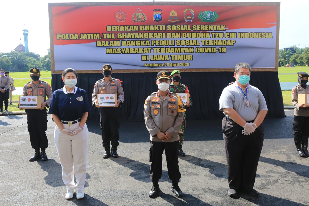 Terkait dalam giat ini Polda Jatim bersinergi dengan Jajaran TNI melalui Personil Bhabinkamtibmas dan Polwan maupun Bhabinsa, bekerjasama denganYayasan Buddha Tzu Chi untuk segera melaksanakan pembagian Sembako kepada Warga terdampak Covid 19 tersebut.