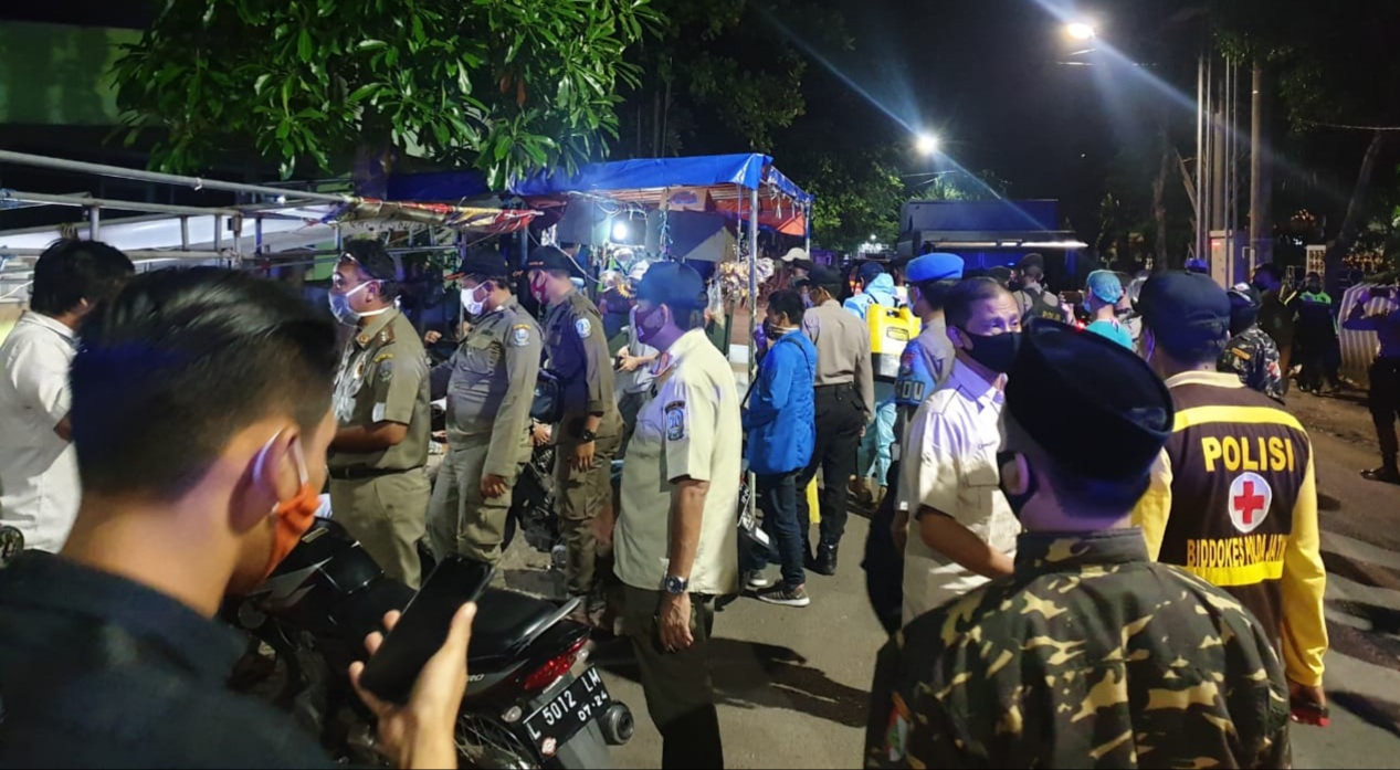 Selanjutnya petugas menuju ke Simpang 3 Jl. Pegirian Surabaya, dilokasi itu dilakukan himbauan dan pembinaan bagi pedagang serta pembeli di sepanjang jalan itu, sekaligus dianjurkan untuk membubarkan diri dan diminta untk kembali kerumah serta harus mematuhi aturan jam malam yang diterapkan PSBB.