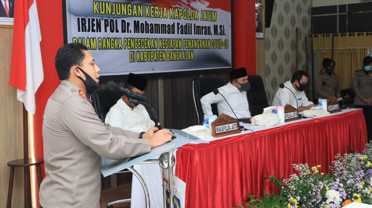 SURABAYA-Kapolda Jatim Irjen Pol Dr. M. Fadil Imran, M.Si melaksanakan Kunker ke Polres Bangkalan dalam rangka mengevaluasi penanganan Covid 19 dan didampingi Waka Polda Jatim, Dirintelkam Polda Jatim, Dirpolairuda Polda Jatim dan Kabidhumas Polda Jatim, Bangkalan, Sabtu 16 Mei 2020.