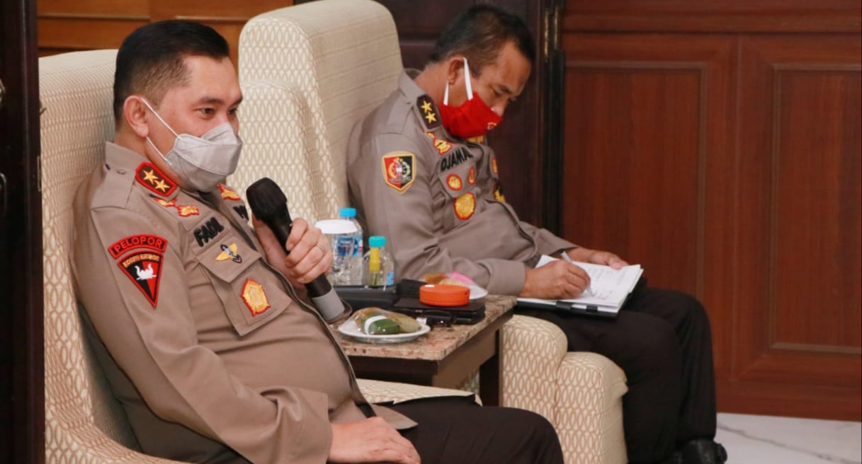 SURABAYA-Kapolda Jatim Irjen Pol Dr. M. Fadil Imran, M.Si didampingi Waka Polda Jatim Irjen Pol Drs. Djamaludin dan Irwasda Polda Jatim Brigjen Pol Awi Setiyono, S.I.K, M.Hum, dan Kapolda Jatim langsung memimpin Rapat Terbatas dengan para Pejabat Utama Polda Jatim, bertempat di Gedung Patuh Mapolda Jatim. Selasa 26 Mei 2020.