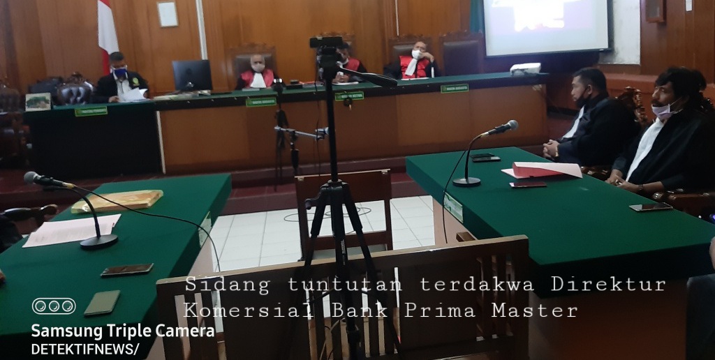 SURABAYA-Sidang Terdakwa Agus Tranggono Prawoto mantan Direktur Komersial PT. Bank Prima Master yang berkantor di Jembatan Merah Surabaya oleh Kejaksaan dituntut dengan hukuman 7 Tahun enam bulan penjara dan denda 1 M subsider 3 bulan kurungan , di ruang Candra PN Surabaya, Senin (8/6/2020).