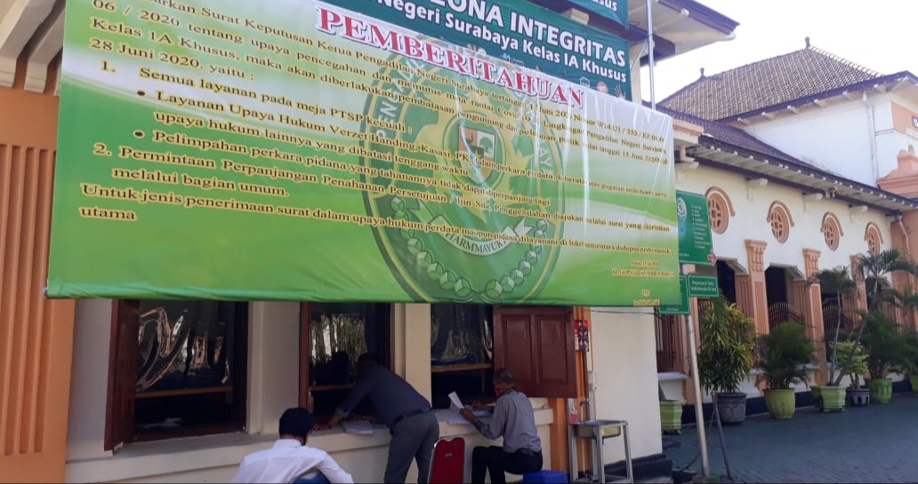 Pihak Pengadilan Negeri Surabaya telah menunda persidangan perdata, pidana, dan semua yang berhubungan dengan pelayanan hingga tanggal 29 juni 2020, akan tetapi, ada pelayanan yang sifatnya mendesak seperti halnya penahanannya sudah tidak bisa di perpanjang lagi maka akan tetap dilayani dengan secara terbatas. Adapun kebijakan seperti halnya penahanan, izin penggeledahan dan lain lain yang bersifat urgent tetap disiapkan pelayanan di depan.
