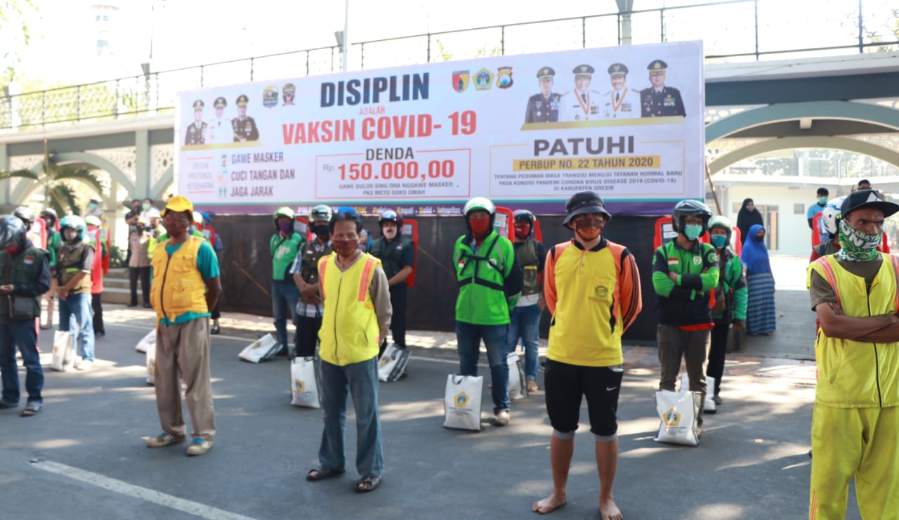 SURABAYA-Waka Polda Jatim Brigjen Pol Drs. Slamet Hadi Supraptoyo bersama Forkopimda Kabupaten Gresik dan Pejabat Utama Polda Jatim, untuk membagikan Sembako maupun Masker kepada pengemudi Ojol serta Konvensional bertempat di Alun Alun Gresik, Sabtu 4 Juli 2020 pukul 09.00 WIB.