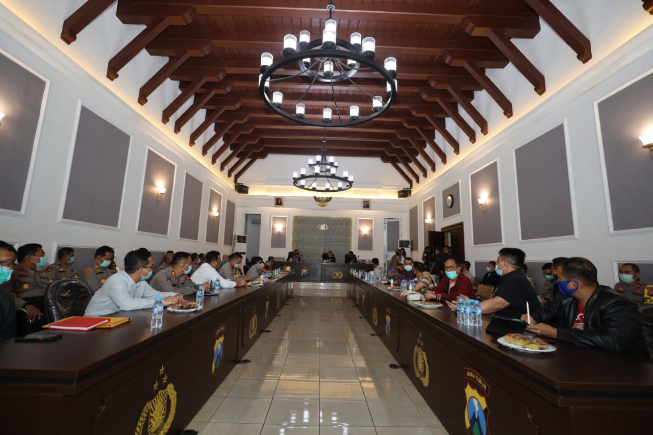SURABAYA-Kapolda Jatim Irjen Pol Dr. M. Fadil Imran, M.Si didampingi Wakapolda Jatim Brigjen Pol Drs. Slamet Hari Supraptoyo, Pejabat Utama Polda Jatim dan Kabidhumas Polda Jatim Kombes Pol Trunoyudo Wisnu Andiko serta Kapolrestabes Surabaya Kombes Pol Jhonny Eddizon Isir, S.I.K, M. T. C. P serta Kapolsek Jajaran dan Sekda Prov Jatim Heru Tjahjono. Dalam giat gelar Analisa dan Evaluasi (Anev) penanganan covid19 di wilayah Polrestabes Surabaya, Sabtu 4 Juli 2020.