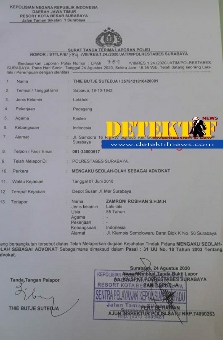 SURABAYA-Makelar kasus mengaku pengacara, diduga tipu korban Thie Butje Sutedja (78) akhirnya Resmi melaporkan inisial ZR alias SD alias G (55) ke Polrestabes Surabaya sore tadi, Senin Agustus 2020.