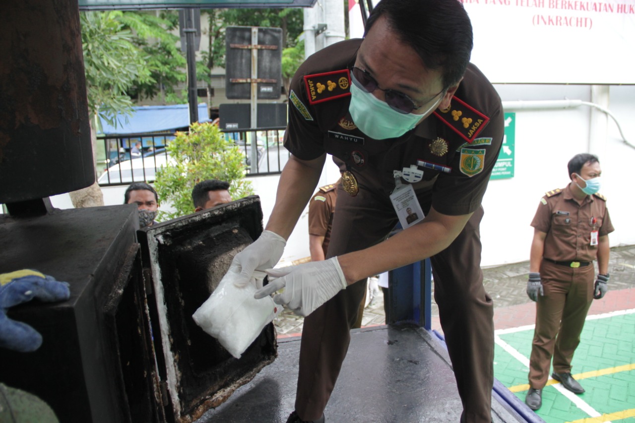Menurut Kepala Seksi Intelejen Kejari Tanjung Perak, Eric Ludfiansyah menjelaskan, bahwa barang bukti yang dimusnahkan pada kali ini, berupa barang bukti sebanyak 8.793,589 gram sabu beserta alat hisap dari 104 perkara narkotika, mulai bulan November hingga Desember 2020.