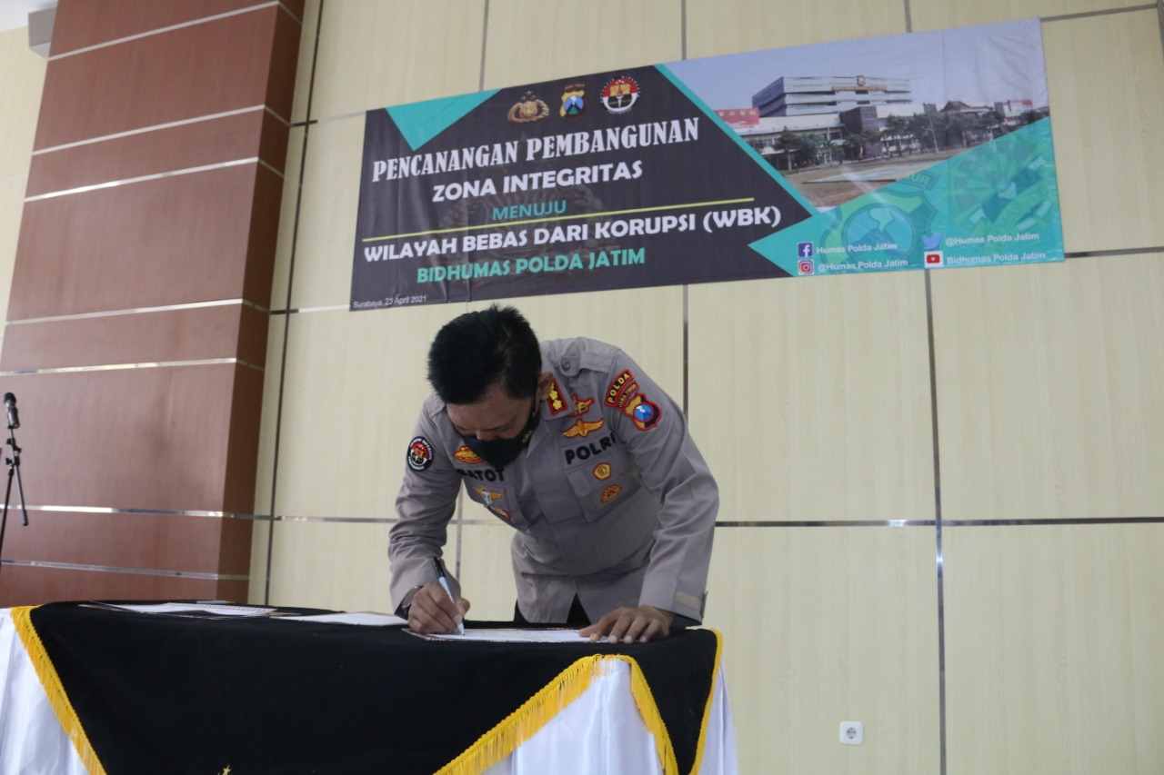 ” Pembangunan Zona Integritas ini adalah mendukung Pemerintah mewujudkan Good Goverment dalam mewujudkan Pemerintah yang Bersih dari KKN. Sebagai wujud perbaikan Pelayanan Publik,” tutur Kabidhumas Polda Jatim Kombes Pol Gatot Repli Handoko, Jumat 22 April 2021 siang.