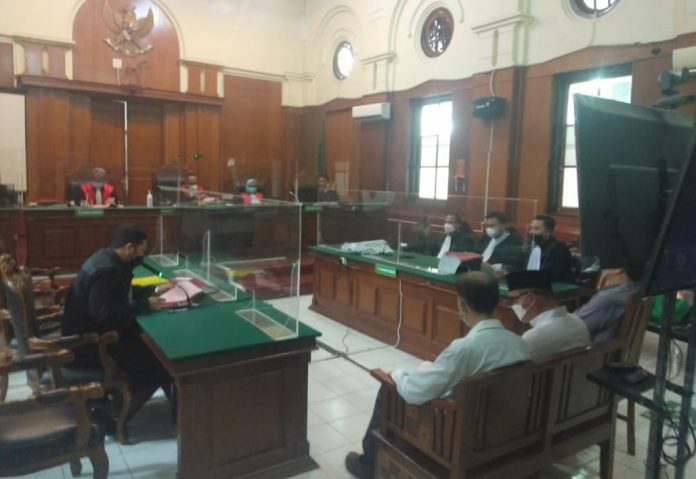 SURABAYA-Ketua Majelis Hakim PN Surabaya, Taufan Mandala memimpin sidang perdana pada 3 terdakwa ambrolnya mainan perosotan Kenjeran Water Park Surabaya. Ketiganya adalah Paul Stepen Tedjianto dan Subandi selaku General Manager dan Manajer Operasional Kenjeran Water Park, lalu Soetiadji Yudho selaku pemilik.