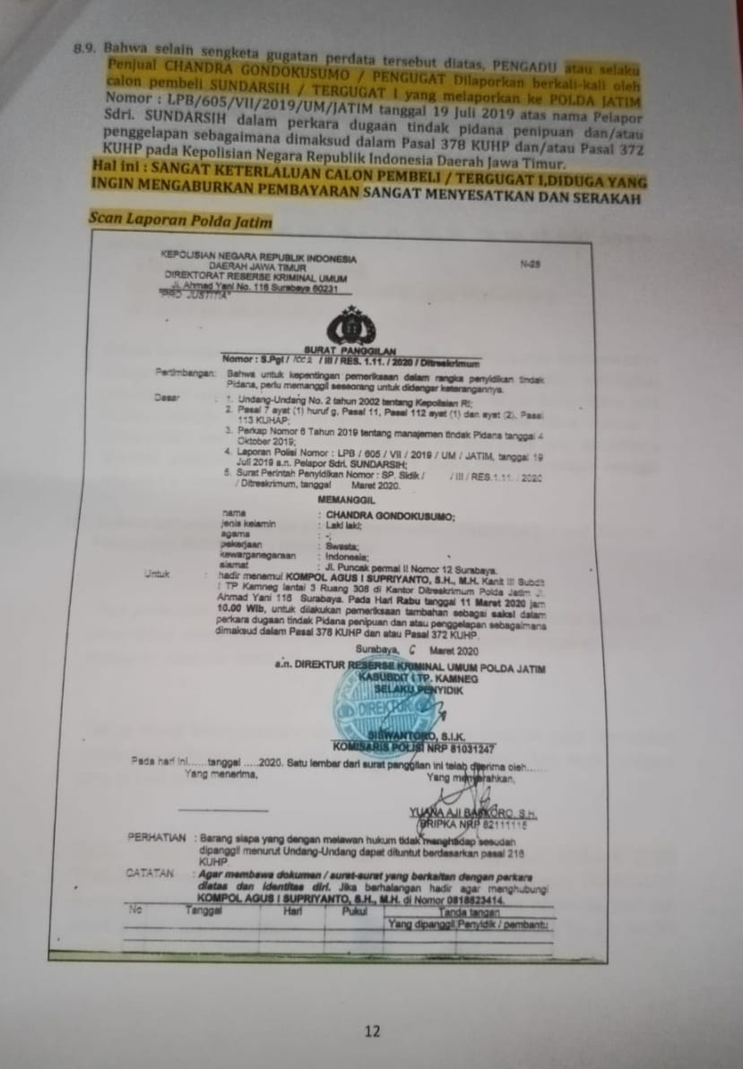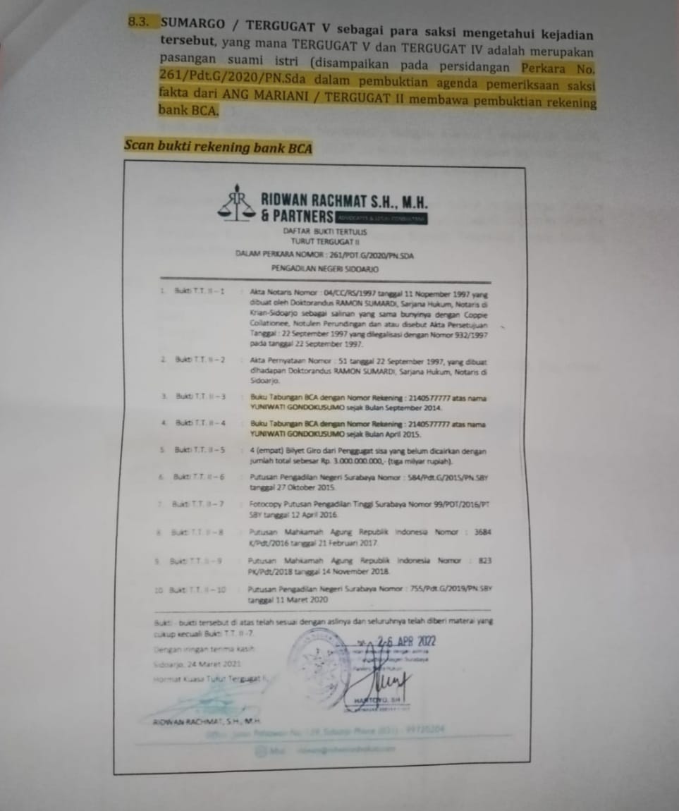 Untuk diketahui, Sebelumnya pada perkara tahun 2020, Sundarsih yang menguasakan kepada 5 orang pengacara, Pernah menggugat Chandra Gondokusumo di PN Sidoarjo berseta pihak-pihak termasuk Inggrid Sugiyani istri Chandra, Namun, tampak dalam status putusan hakim sesuai nomor perkara 261/Pdt.G/2020/PN SDA, jika gugatan Sundarsih ditolak hingga selanjutnya, melakukan upaya hukum tingkat atas. {Tim}