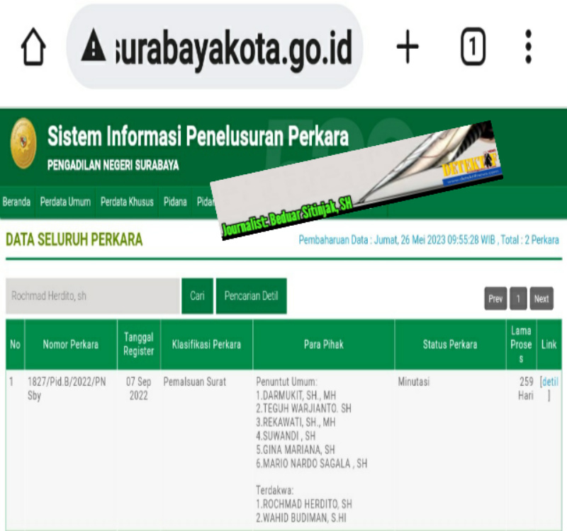 Diketahui informasi kasus ini, Kedua terdakwa merugikan pihak debitur sehingga dilaporkan oleh PT Alam Galaxy selaku saat perkara Penundaan Kewajiban Pembayaran Utang (PKPU) berjalan, Akibat tagihan kreditor diduga dibengkakan sehingga PT Alam Galaxy dipailitkan oleh hakim niaga Pengadilan Niaga pada PN Surabaya.