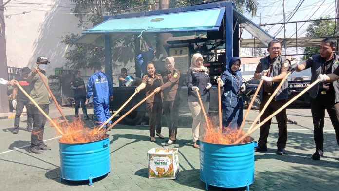 SURABAYA-Kejaksaan Negeri (Kejari) Tanjung Perak Surabaya menggelar kegiatan pemusnahan barang bukti (BB), hasil kejahatan perkara tindak pidana yang telah berkekuatan hukum tetap (Inkracht).