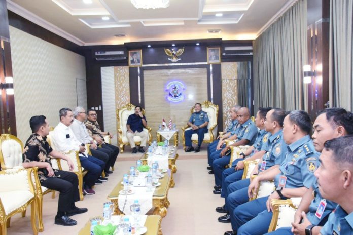 SURABAYA-Wakil Komandan Komando Pembinaan Doktrin, Pendidikan dan Latihan TNI Angkatan Laut (Wadan Kodiklatal) Laksda TNI Supardi, menerima kunjungan kerja dari Komisaris Utama PT.Pelindo Laksamana TNI (Purn) Agus Suhartono di Ruang Lobby VIP Mako Kodiklatal Bumimoro Surabaya , Selasa (18/7/2023).