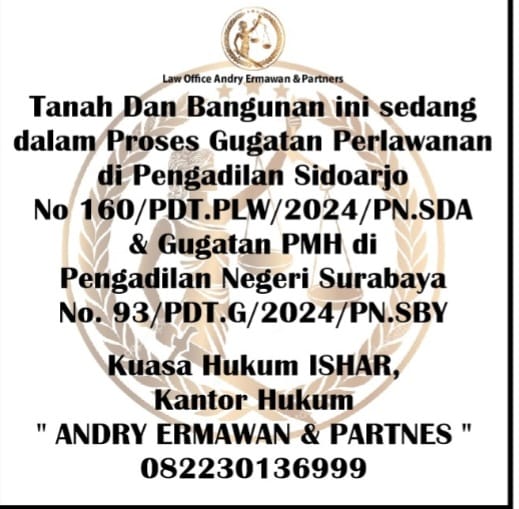 Terpisah Kuasa Hukum Penggugat Andry Ermawan, Locus objek itu ada di Sidoarjo dengan nomer perkara 160/Pdt PLW/2024/pn sda, perkara ini juga masih proses gugatan Perlawan dipn Sidoarjo, dan masih mediasi,” paparnya.