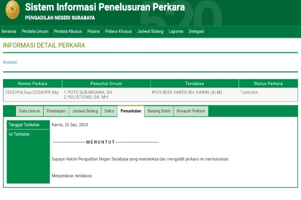 Sorot surabaya – Terdakwa Puti Budi Yanto Pengedar sabu 100 gram sabu dan 529 exctacy diduga mendapat perlakuan khusus dari jaksa penuntut umum kejati jawa timur.