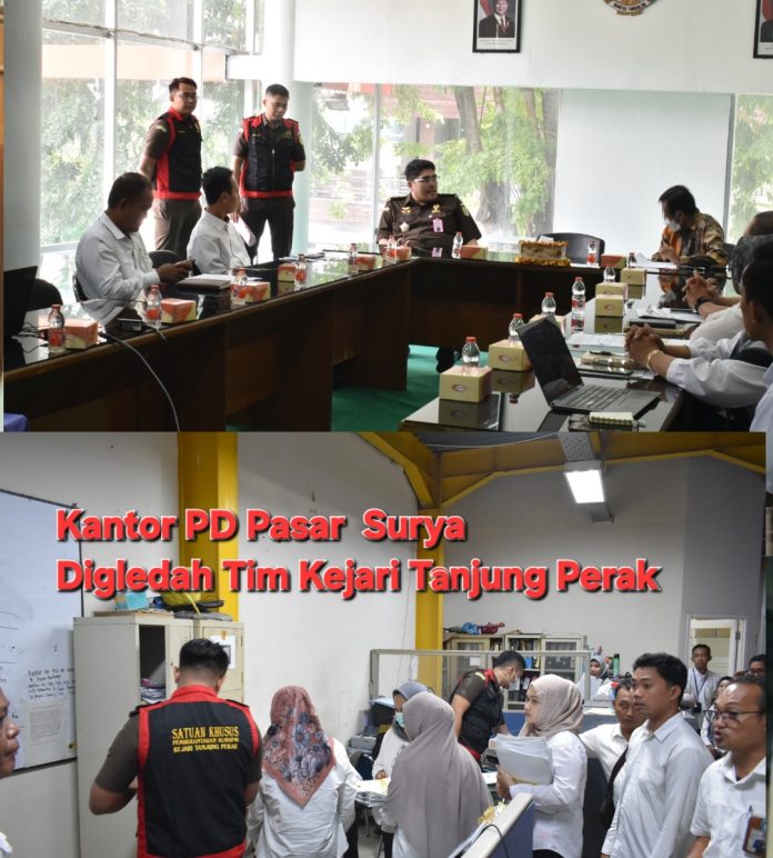 SURABAYA-Tim Penyidik Tindak Pidana Khusus Kejaksaan Negeri Tanjung Perak melakukan penggeledahan di Kantor PD Pasar Surya, Jalan Manyar Kertoarjo No. 2, Surabaya, Senin, (30/3/2026).